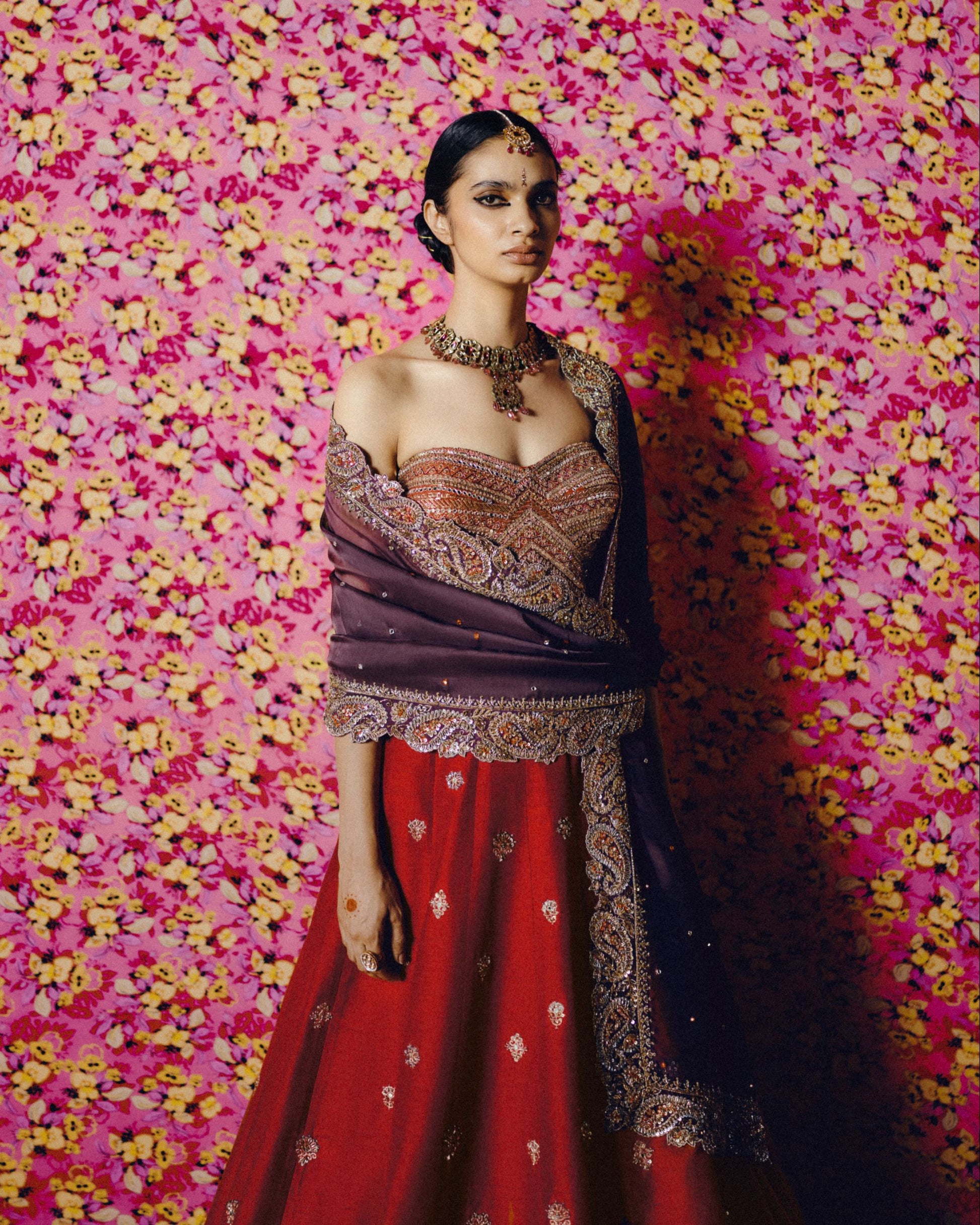 The Ahalya Lehenga Set features a vermillion, heavily embroidered corset paired with an all-over butta lehenga, gracefully finished with a cutwork dupatta in a deep vineyard hue. Rich, radiant, and intricately detailed, this ensemble transforms color and craftsmanship into a flowing celebration of elegance and timeless charm.