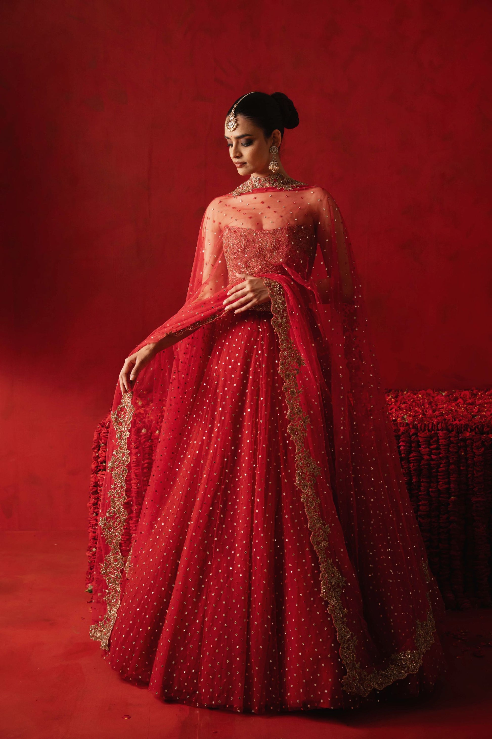 The Anangaa Lehenga Set is drenched in a luminous ruby red, a color inseparable from celebration. Scattered mirror buttis shimmer across the lehenga like cherished fragments of childhood memory, while the heavily adorned corset blouse in cerise pink adds a bold, jewel-toned contrast. Radiant and expressive, this ensemble captures the joy of adornment and the quiet magic of reflection, where every mirror carries a story forward.