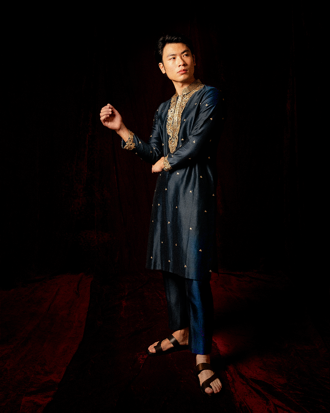 The Caspian Kurta Set is rendered in a deep midnight blue, radiating elegance and sophistication. It is intricately hand-embroidered around the placket and sleeves with pitta, cutdana, sequins, glass beads, and mirrors, while scattered single mirrors across the kurta add subtle shimmer and grandeur. This ensemble exemplifies meticulous craftsmanship, striking the perfect balance between opulence and refined artistry.