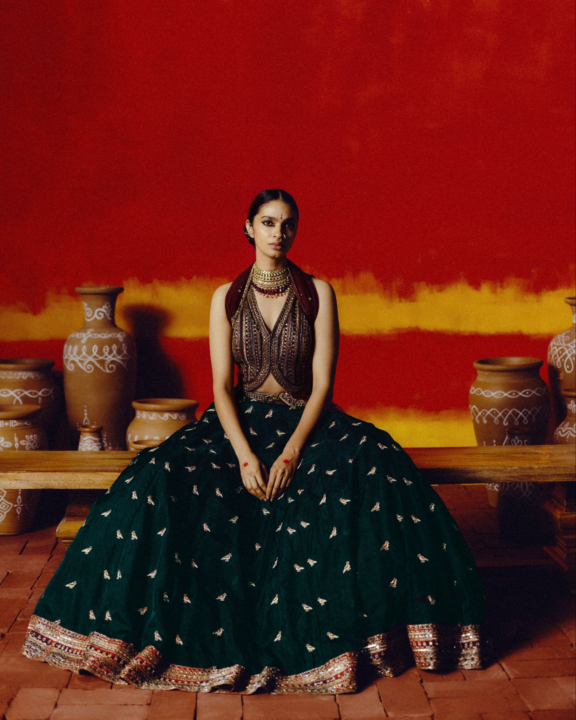 The Devangana Lehenga brings a refreshing, luminous beauty to Varnam with its rich green hue and charming vest-style silhouette. Delicate zari parrot embroidery, inspired by the motifs often seen in temple jewelry and traditional Tamil artistry, adds a touch of grace and symbolism. Light-catching, detailed, and thoughtfully crafted, this ensemble blends playful elegance with cultural memory, perfect for celebrations that call for something distinctive and beautifully rooted.