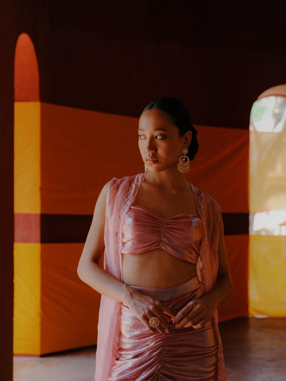 The Iridescent Blush Skirt Set in candy pink is a stunning and playful