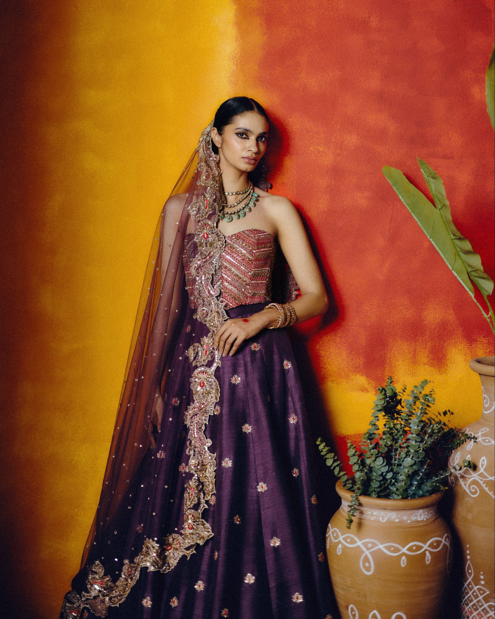 A celebration of geometry and grace. The corset top is richly embroidered, echoing the precision of artisanal craft. The lehenga carries an exquisitely heavy embroidered border, flowing into an expanse of delicate all-over floral motifs. A harmonious blend of structure and softness, this lehenga set feels like a verse woven in thread, where geometry meets poetry in every movement.