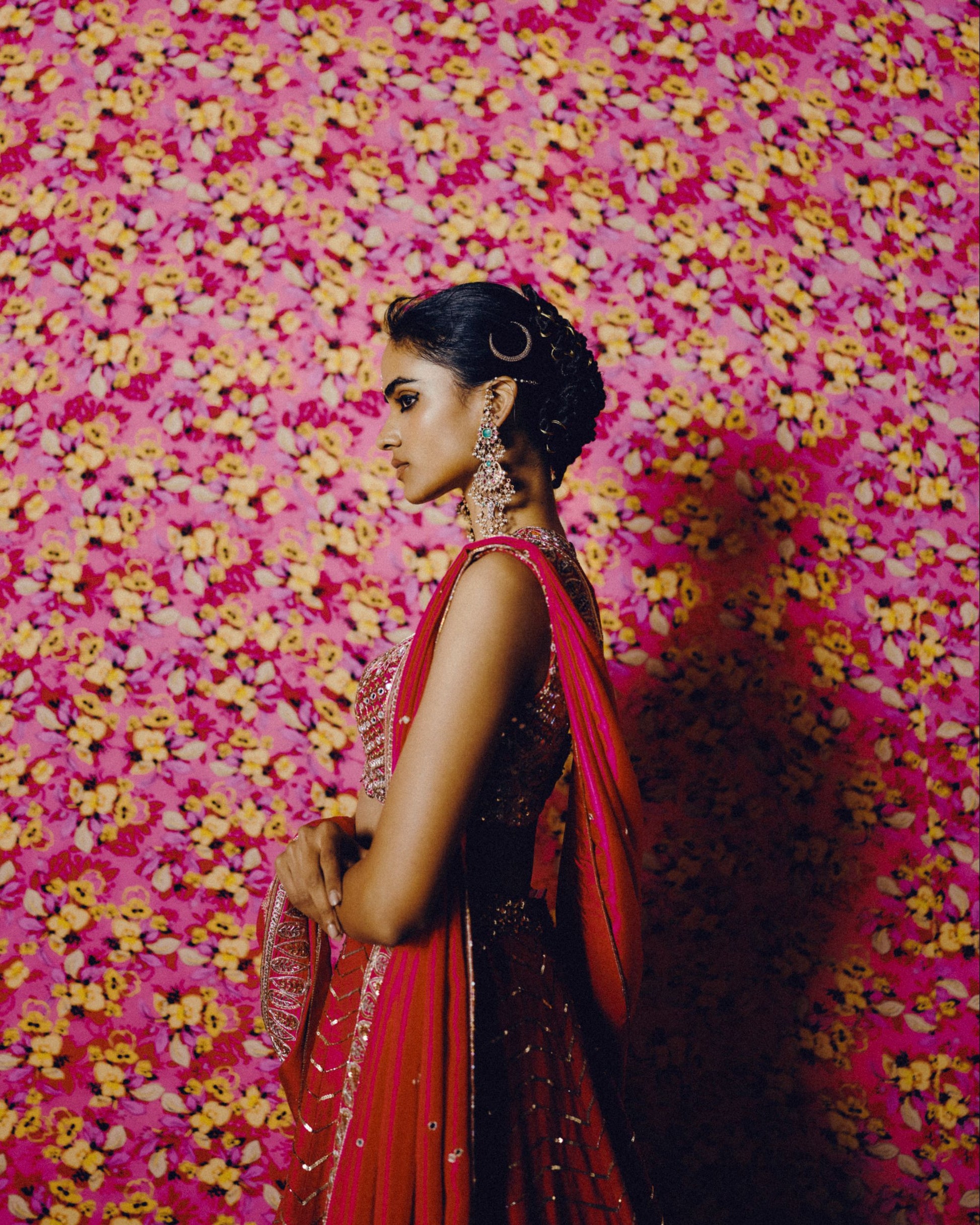 A resplendent ode to Tamil Nadu’s blooming landscapes, this lehenga is drenched in a rani pink reminiscent of radiant temple roses in full blossom. The silhouette is richly adorned with beautiful zigzag line work, while shimmering mirror-zari motifs catch the light like dew resting on fresh petals. The intricately embroidered blouse completes the ensemble, celebrating the grace of nature, the poetry of flowers, and the timeless richness woven through Tamil heritage.
