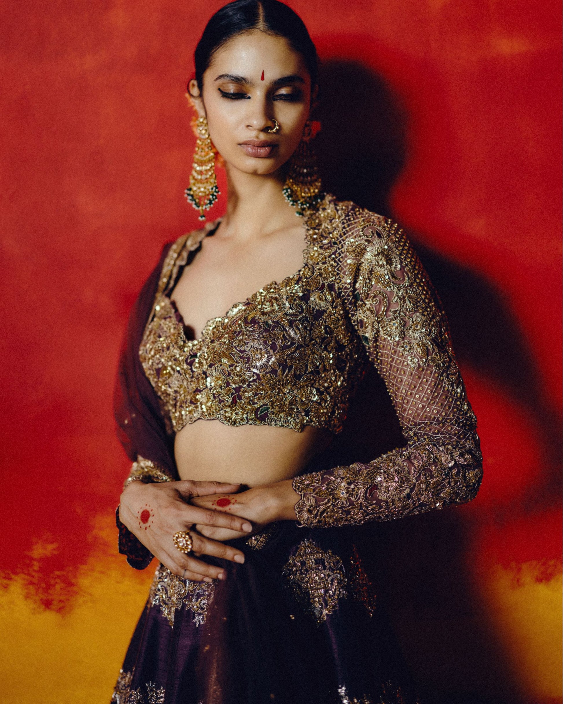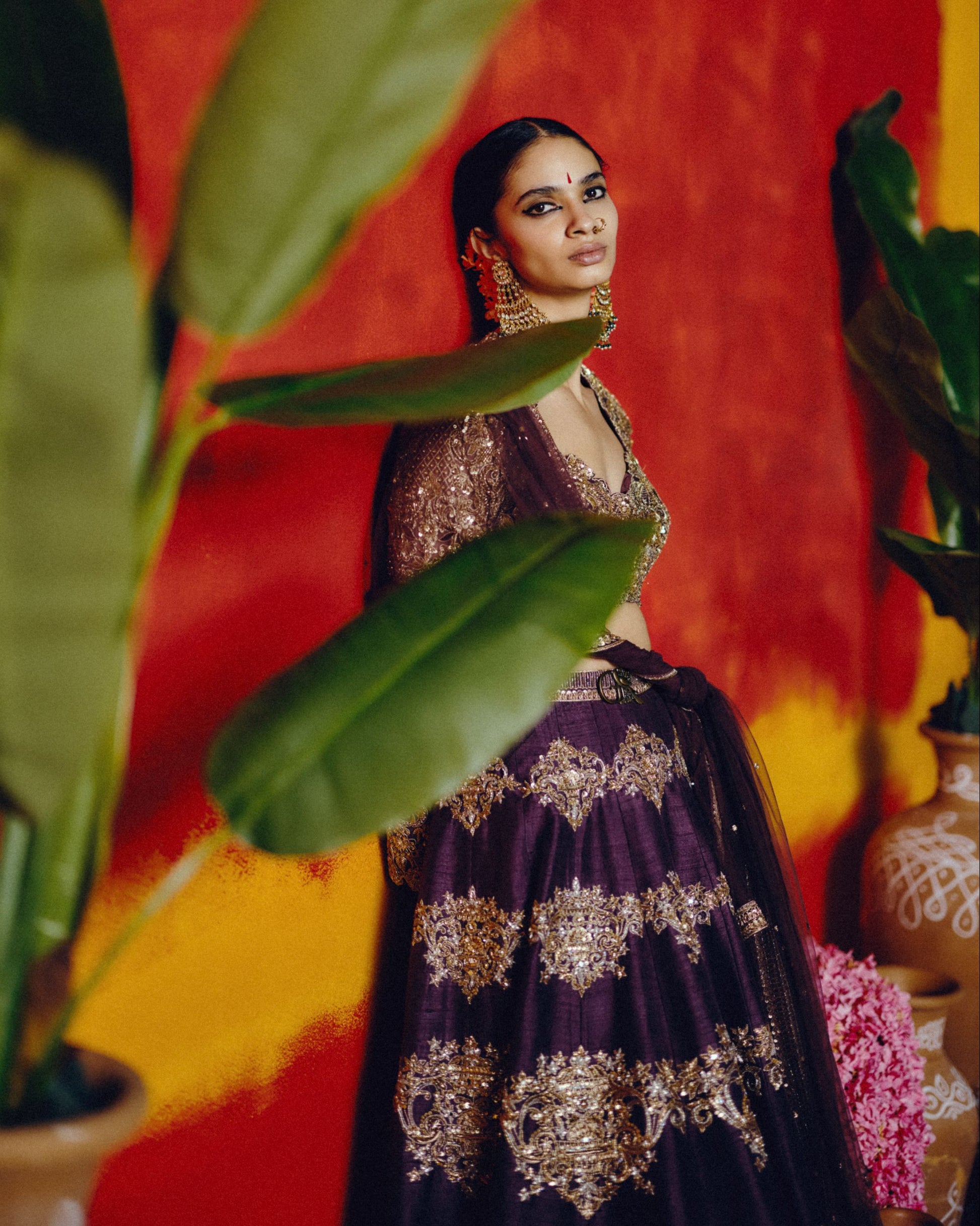 Dipped in a deep, elegant aubergine purple, the Meghamala Lehenga carries the quiet poetry of temple sculptures. Its handcrafted florals, jaalis, and sacred geometric motifs flow seamlessly across the garment, echoing the rhythmic continuity found in ancient carvings. Thoughtfully detailed and beautifully fluid, this ensemble turns heritage inspiration into a graceful, modern celebration of craft.
