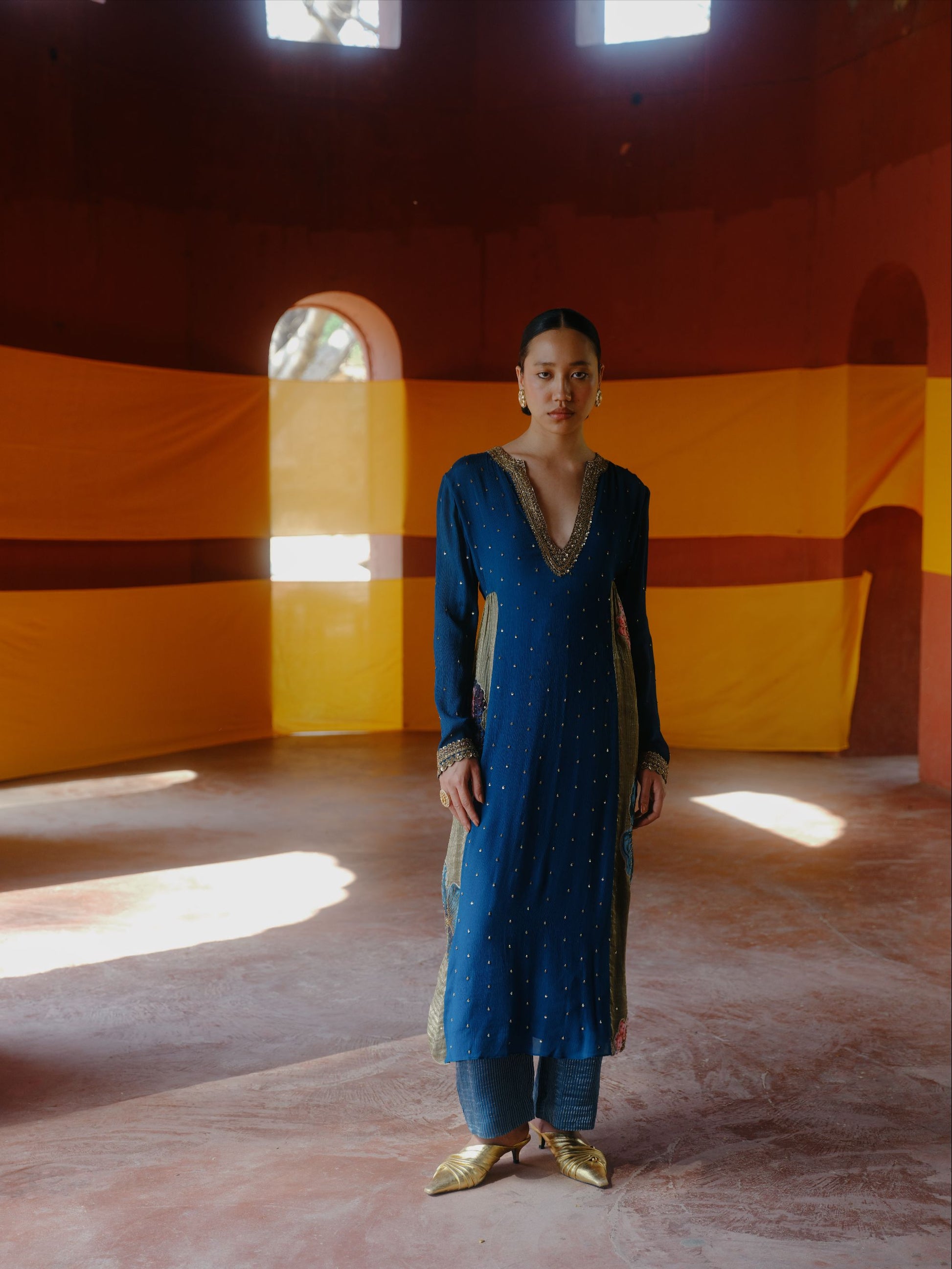 The Midnight Sage Kurta Set is an elegant ensemble in a striking cerulean blue, exuding sophistication and charm. The kurta features delicate detailing, accented with intricate hand embroidery and subtle embellishments that enhance its refined design. Offering both comfort and opulence, the Midnight Sage Kurta Set effortlessly blends timeless beauty with contemporary elegance for a truly captivating look.