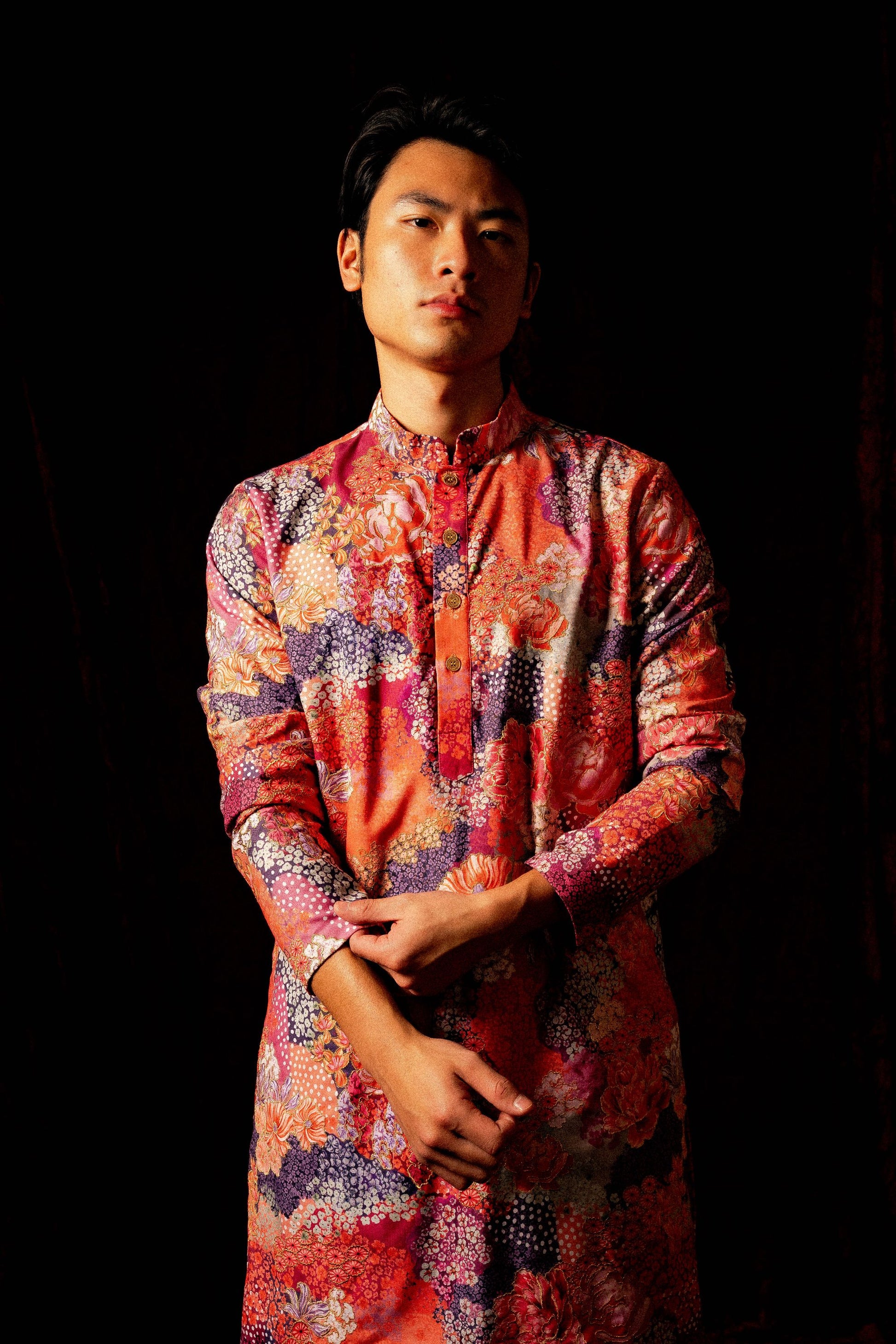 The Sunset Bloom Kurta Set is crafted in our signature collection print, featuring a harmonious blend of reds, pinks, and oranges that come together in a vibrant symphony of colour and form. The kurta is intricately embroidered with zari work across the printed surface, adding a layer of rich texture and opulent detail. The result is a striking ensemble that captures the radiance of a sunset — bold, luminous, and exquisitely grand