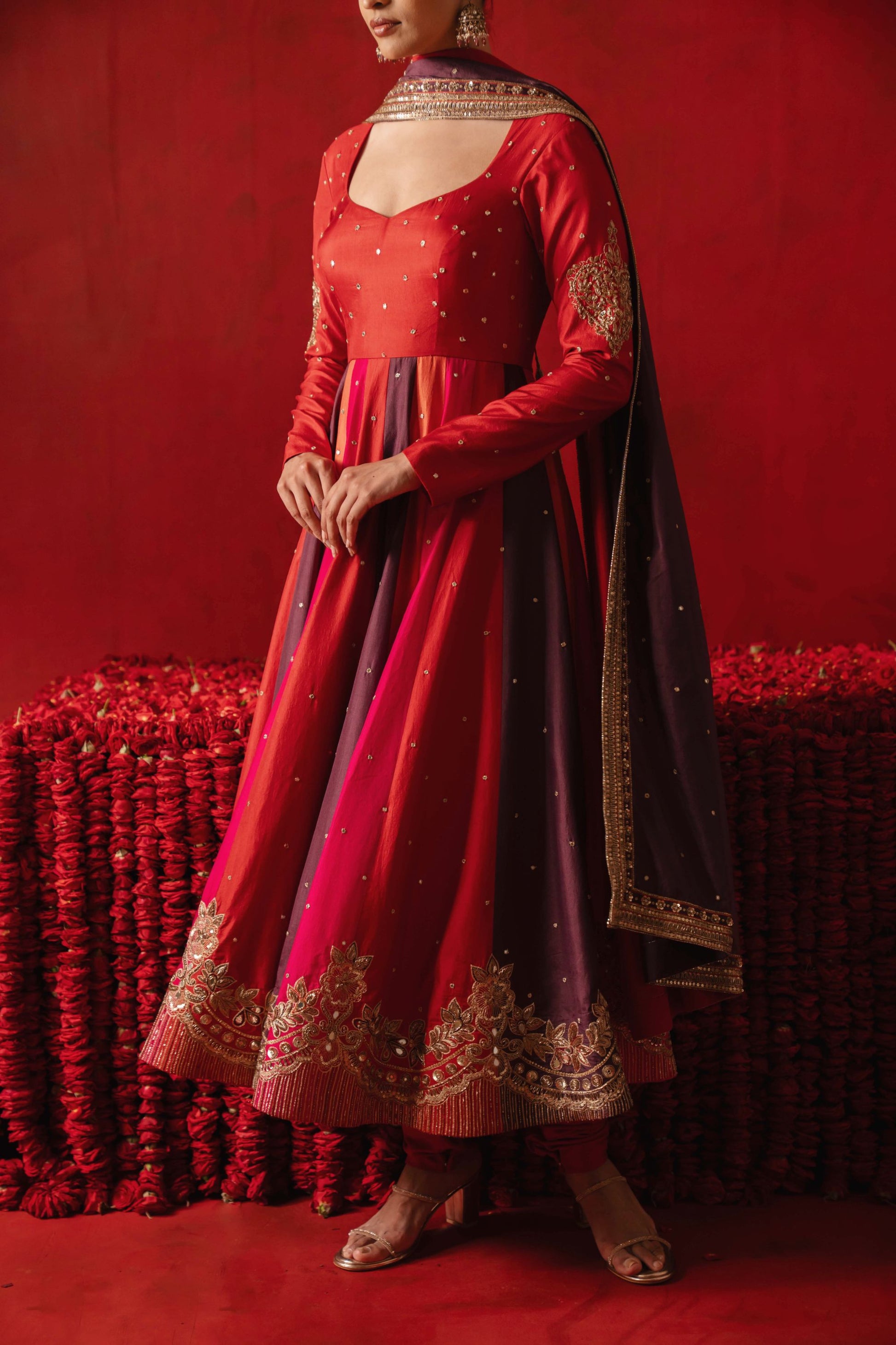 The Tharunika Anarkali Set comes alive through vibrant patchworked panels in ruby red, rani pink, kanakambaram orange, and aubergine purple, colors drawn from ritual, celebration, and everyday vibrance. Intricate border work anchors the flowing silhouette, adding rhythm and structure to its movement. Expressive and graceful, this ensemble brings together color, craft, and continuity in a striking anarkali form.