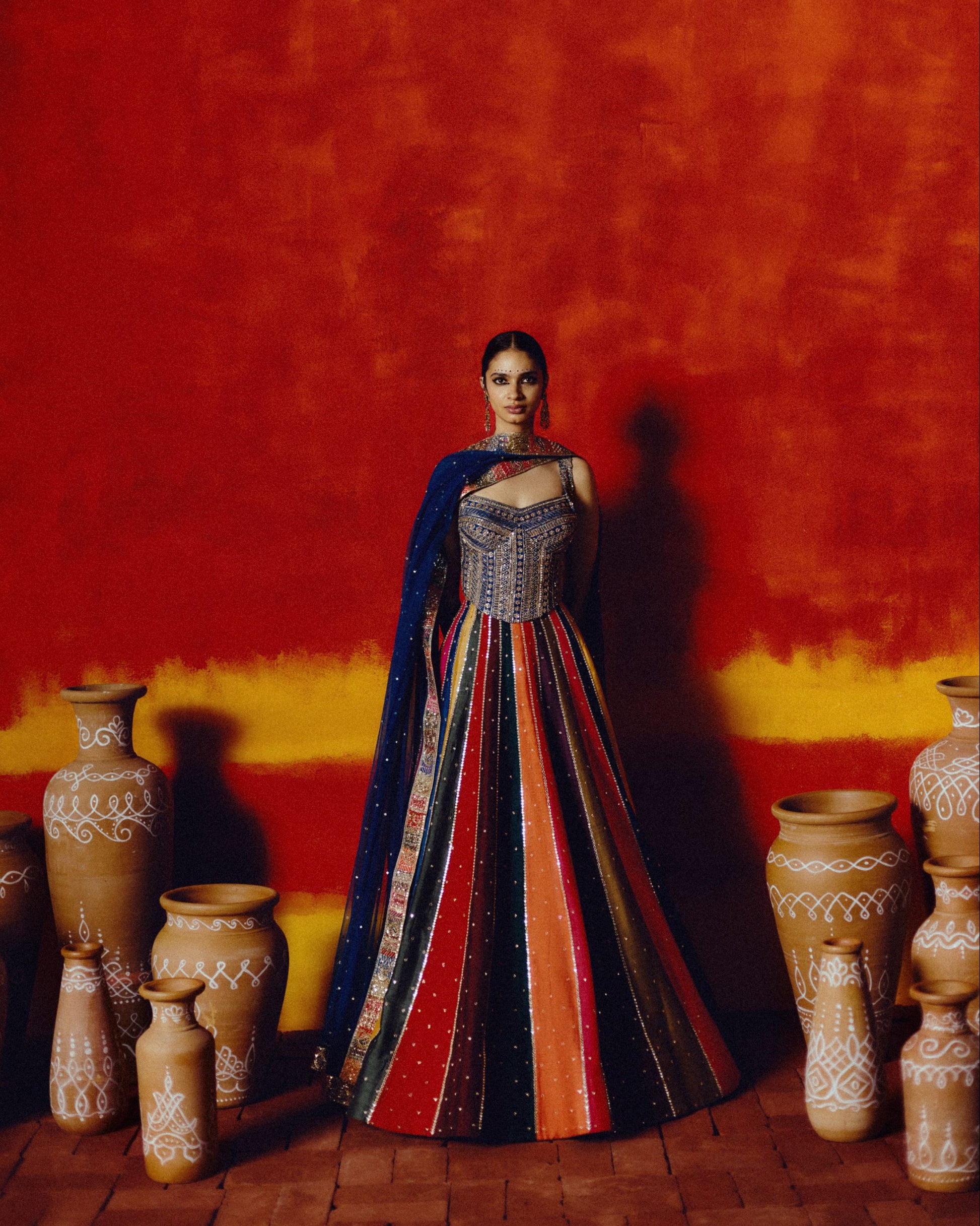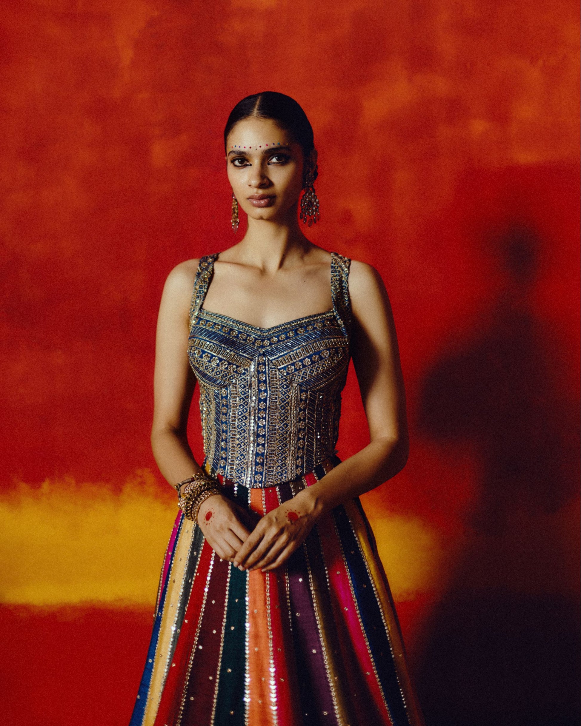 A vibrant celebration of festival spirit, this lehenga comes alive in bright multi-colored panels that echo the joy and rhythm of a Tamil thiruvizha. Mirrored line work glimmers across the ensemble, reflecting light like festive lamps swaying in the evening breeze. The beautifully embroidered corset top pairs with a uniquely crafted tassel, adding a touch of playful artistry. Contemporary in silhouette yet deeply rooted in tradition, this one-of-a-kind set captures the essence of community, color, and celebration.