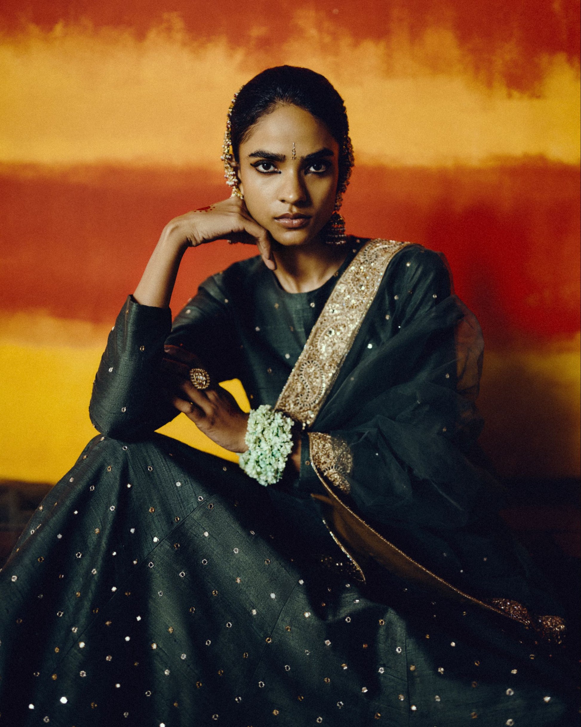 The Valli Anarkali arrives in a serene Deep Forest Green, brought to life with delicate mirror butta work scattered across the silhouette. The mirrors catch light softly as you move, adding a quiet shimmer that feels refreshing and effortlessly elegant. With its fluid drape and understated sparkle, this piece offers a graceful blend of simplicity and refinement.